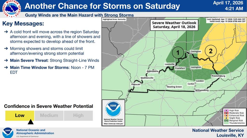 There is a low risk of strong thunderstorms in areas mainly east of I-65 and north of I-64. The main severe weather hazards on Saturday will be heavy rainfall, lightning, and gusty winds.